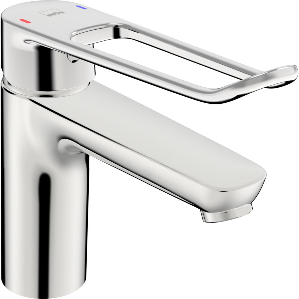 Oras Clinica servantkran med lang hjelpehendel ( 180 mm ) Fast tut, ekstra lang ( 150 mm ) med nikkelfrie vannveier og laminær strålesamler uten innblanding av luft. Faste kobberrør