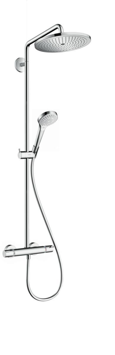 Croma Select S 280 showerpipe i krom. Den består av hodedusj Ø 280 med RainAir strålen, hånddusj med 3 stråletyper: Massasjestråle, IntenseRain og SoftRain, slange, glider, stang og termostat. Maksimal gjennomstrømningsmengde for showerpipe ved 3 bar er 15,7 l/min.