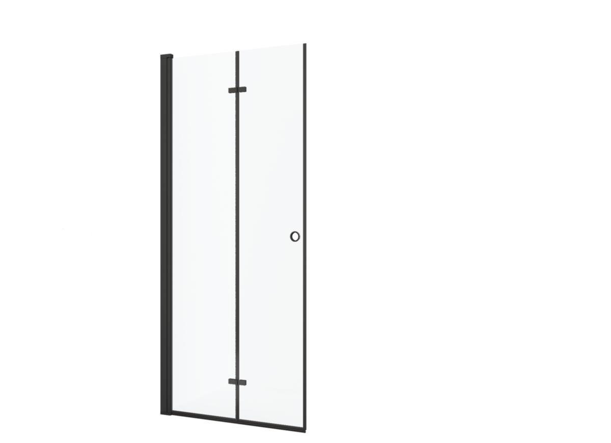 Foldbar dusjdør med svart profil, 6 mm glass med sikkerhetsfilm og easy clean. Alternativt håndttak 1438998. Kan kombineres med rett dør eller fastvegg. Ved montering i nisje må profil 1438986 bestilles i tillegg.