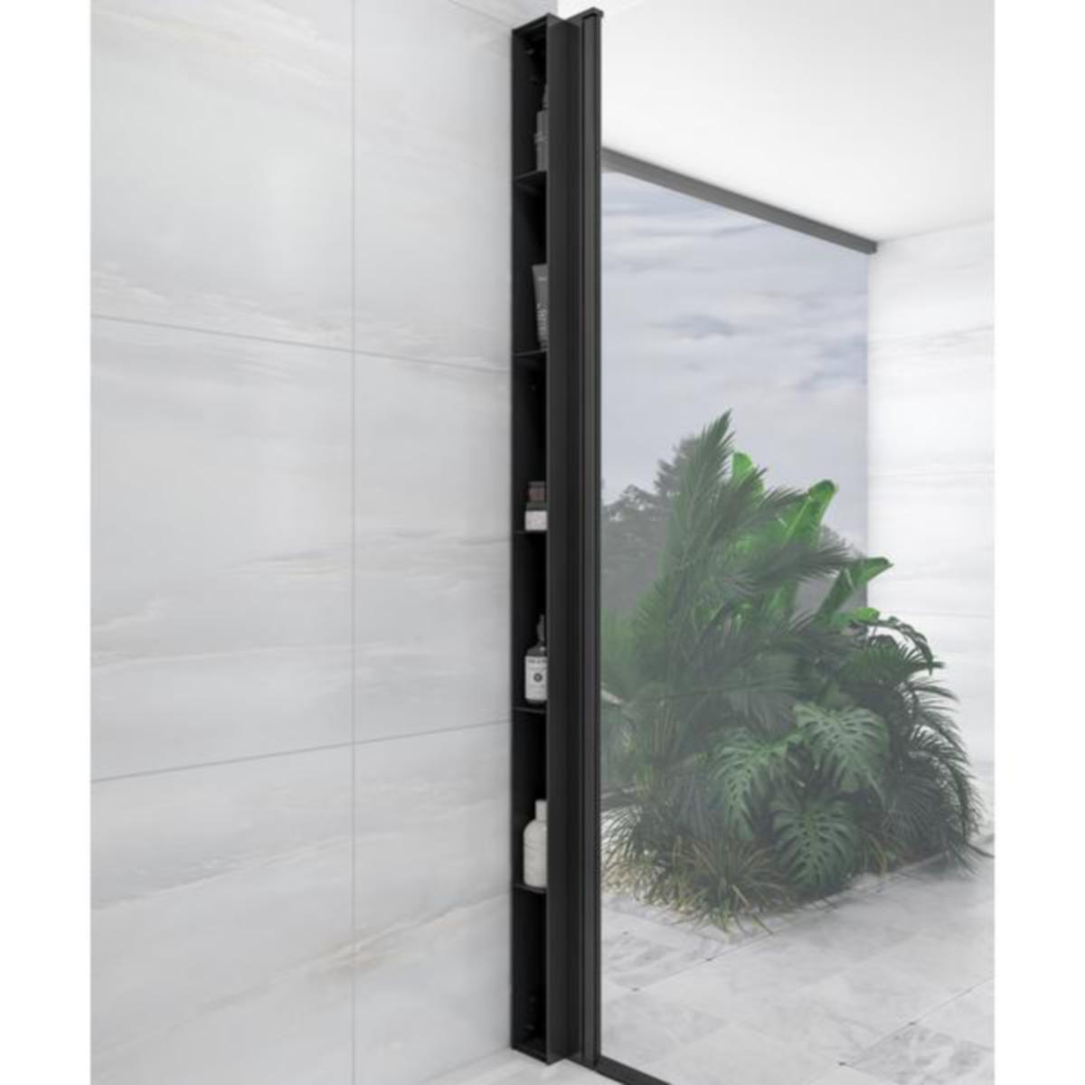 En smart opppbevaringsløsning som passer til Imber I og Imber II. Først monteres hylla, og så monteres dusjdøra på hylla. Denne profilen er 10 cm bred, så husk å trekke fra 10 cm på dusjens totale bredde før du bestiller. Om det for eksempel skal bygges en hjørneløsning med to dører og hylle på den ene siden slik at hjørnet blir 90 x 90cm må det velges en dør/vegg i 90 cm og en dør/vegg i 80cm.