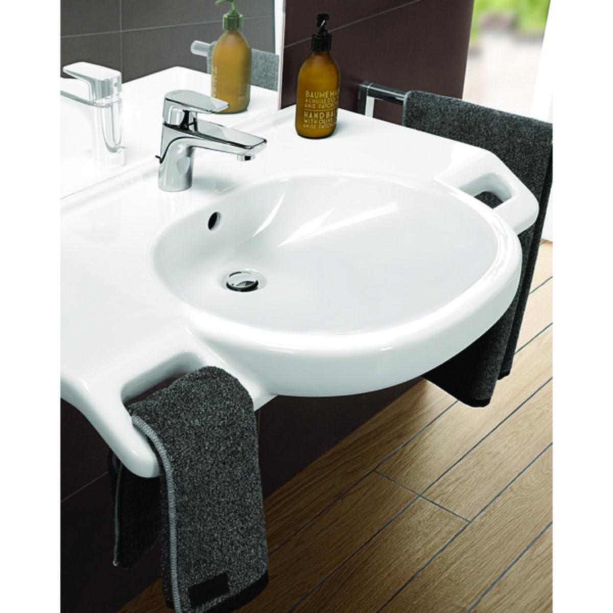 Funksjonell servant med håndtak på hver side av det grunne bassenget. Den er derfor godt tilpasset rullestorbrukere. Det er også god avlastningsplass på sidene av servanten.