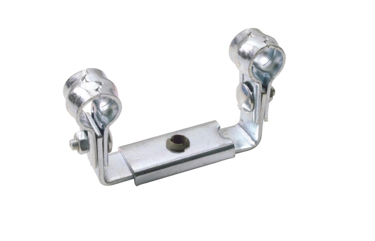 Justerbart el-forsinket dobbelklammer 60 til 80 mm for-montert. Benlengde 30 mm. 8 mm festehull.