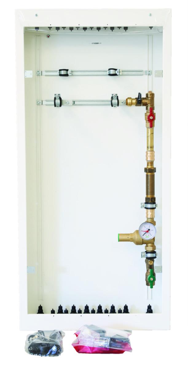 Inntaksskapet leveres med prefabrikkerte nippler oppe/nede, fordelerfester og overløp for drenering følger med. Skapet har en prefabrikkert stamme som inneholder trippelventil (kuleventil, sil, tilbakeslagsvent), reduksjonsventil, passtykke for vannmåler og magnetvent, t-rør og kuleventil på topp. Dør/ramme er pakket i egen emballasje sammen med skapet for å sikre at det ikke blir ødelagt før montering.