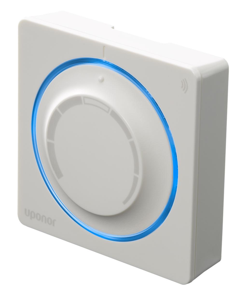 Trådløs termostat med dreieskive med skala, og LED belysning ved aktivering. Tilknyttes Uponor Smatrix Wave Plus Sentralenhet X-165 6X. Leveres med batterier og veggbrakett.