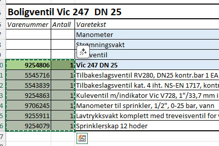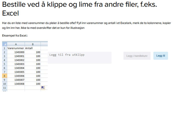 Merk og kopiér (Ctrl+C) de grønne rutene med artikkelnummer/NRF og antall.